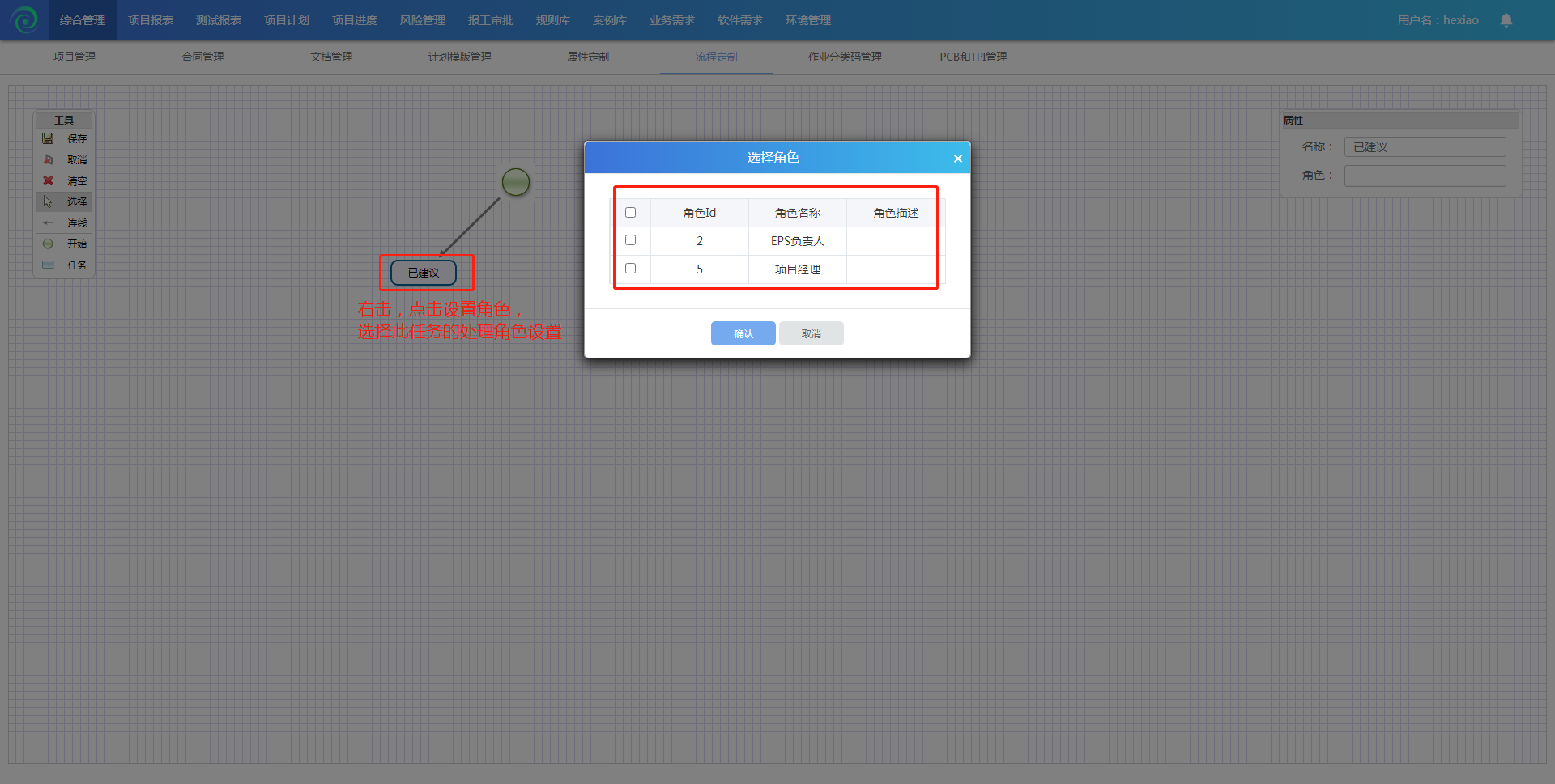 添加任务之后,需要设置任务节点的处理人,右击任务节点,选择设置角色,可进入“选择角色”界面,可设置的角色有EPS负责人、项目经理;