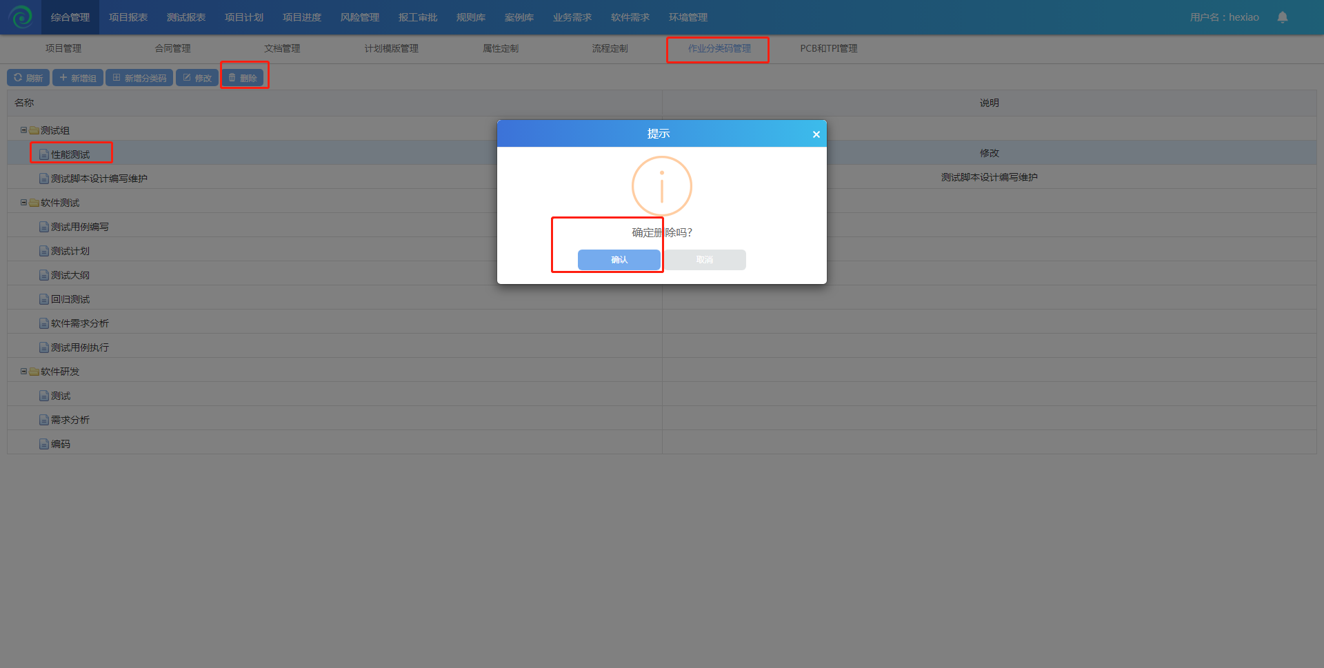 选中一个作业分类码,点击删除,确认后删除成功;(注:分类码组下有子节点的需要先删除子节点,再删除父节点);
