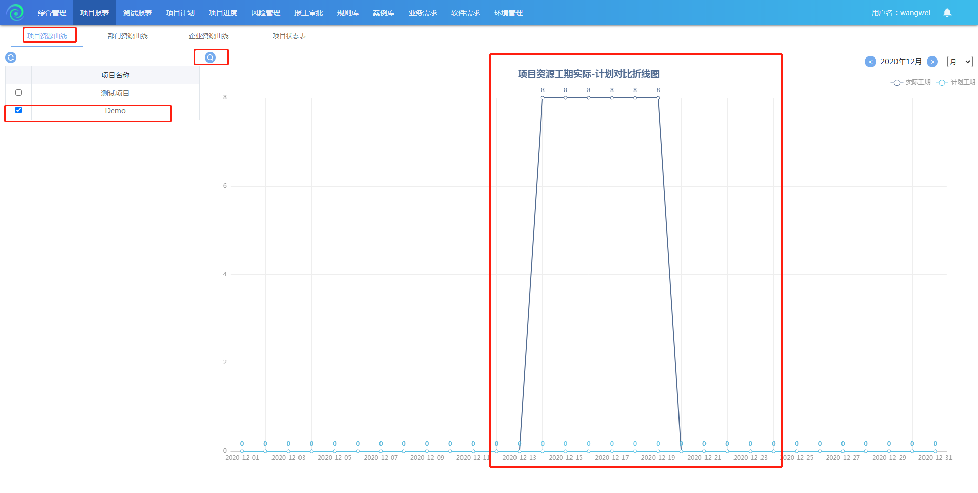 点击【项目资源曲线】进入到项目资源曲线模块,勾选至少一个项目,点击搜索按钮。项目资源工期实际-计划对比折线图,X轴显示与选择的项目、月/年有关,Y轴与选择的项目的总报工(小时)有关。