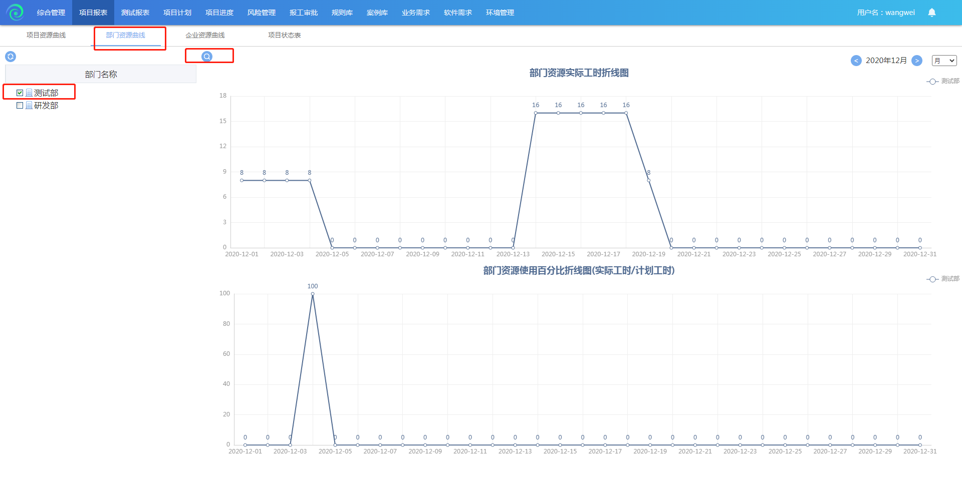 部门资源工期折线图、部门资源使用百分比折线图,X轴与选择的部门中绑定的资源在此项目经理用户下的所有项目作业对应的起末时间和月/年有关,Y轴与选择的部门中绑定的资源在此项目经理用户下的所有项目作业对应的报工(小时)有关。