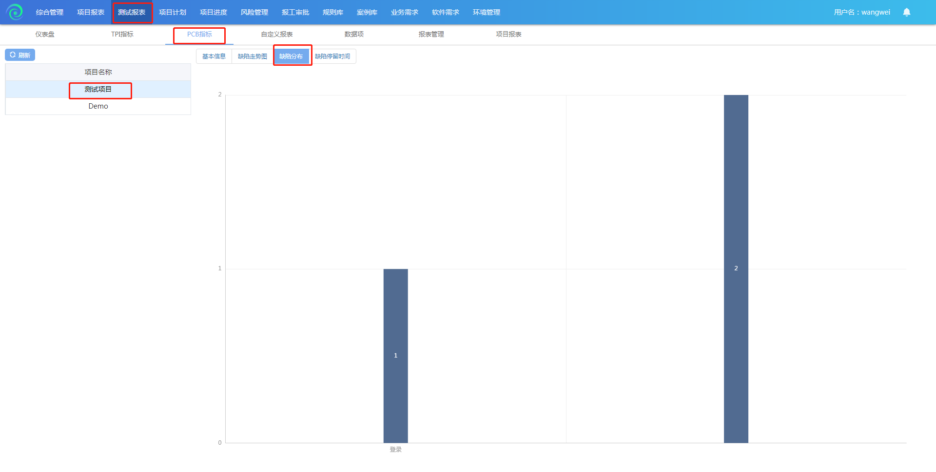选中项目后点击缺陷分布,在左侧图形中会显示以模块名为X轴,以缺陷数量为Y轴的图形,用来展现选中项目的缺陷分布