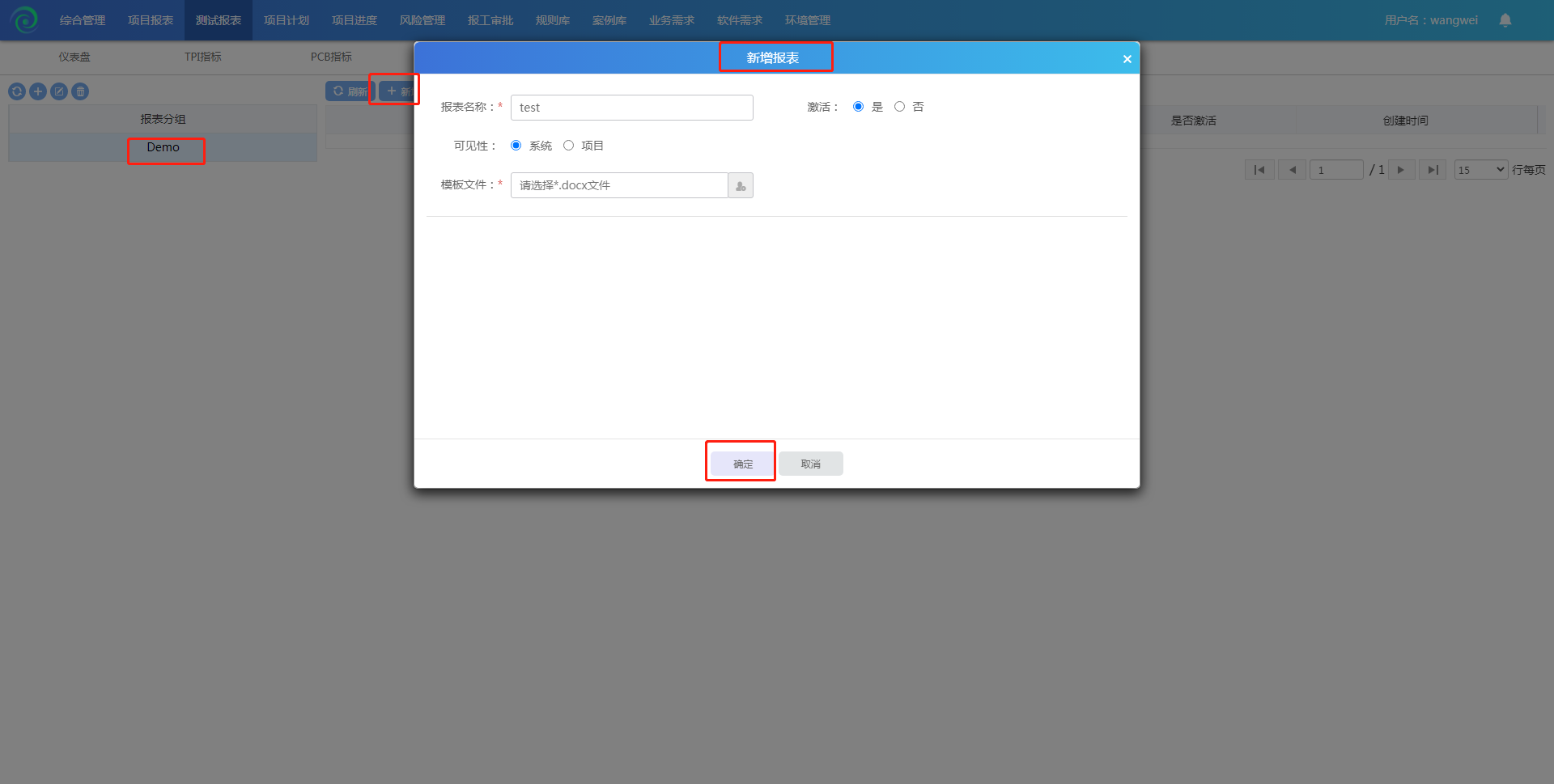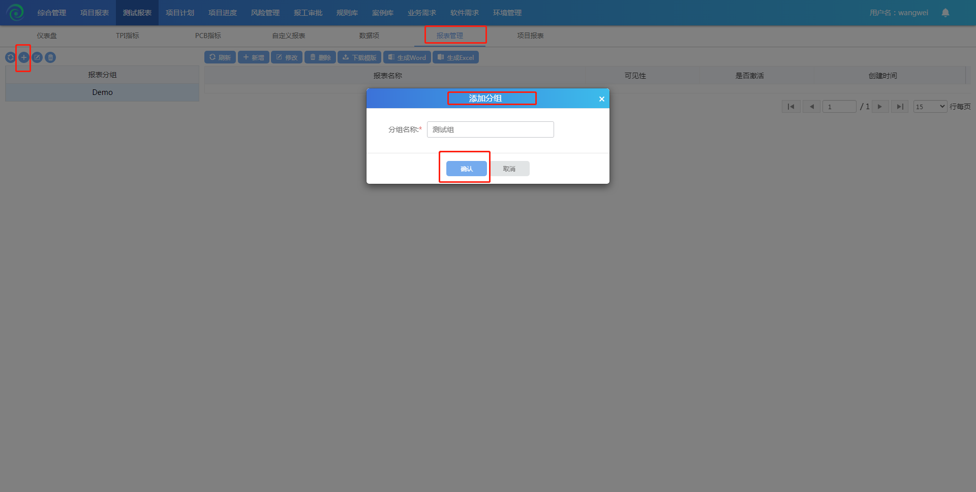 点击报表分组的新增按钮,在新增界面输入分组名称,点击确定成功创建报表分组;