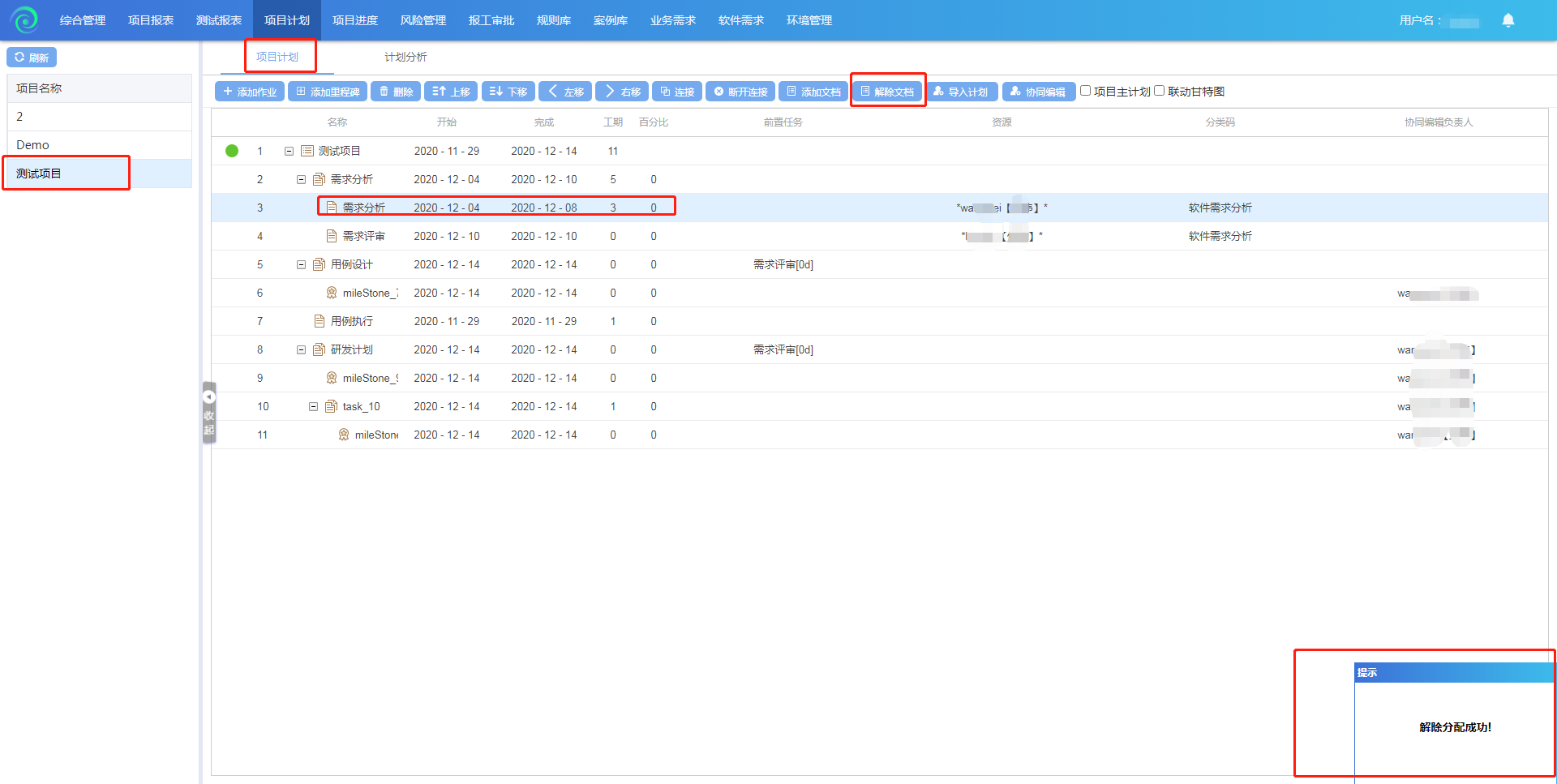 先选中任务节点,点击解除文档,从任务中解除分配的文档;