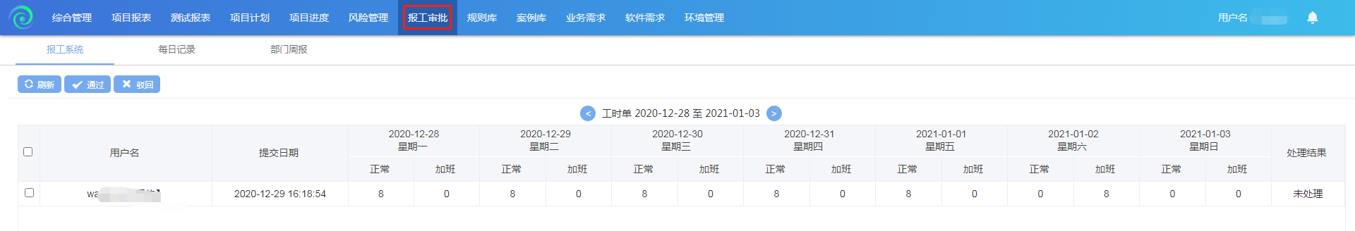 选中项目,会显示项目中所有人的每一周的报工情况,进行审批,点击通过或者驳回,完成审批。(注:粉色标注的代表正常工时未满8小时;黄色标注的代表加班工时);