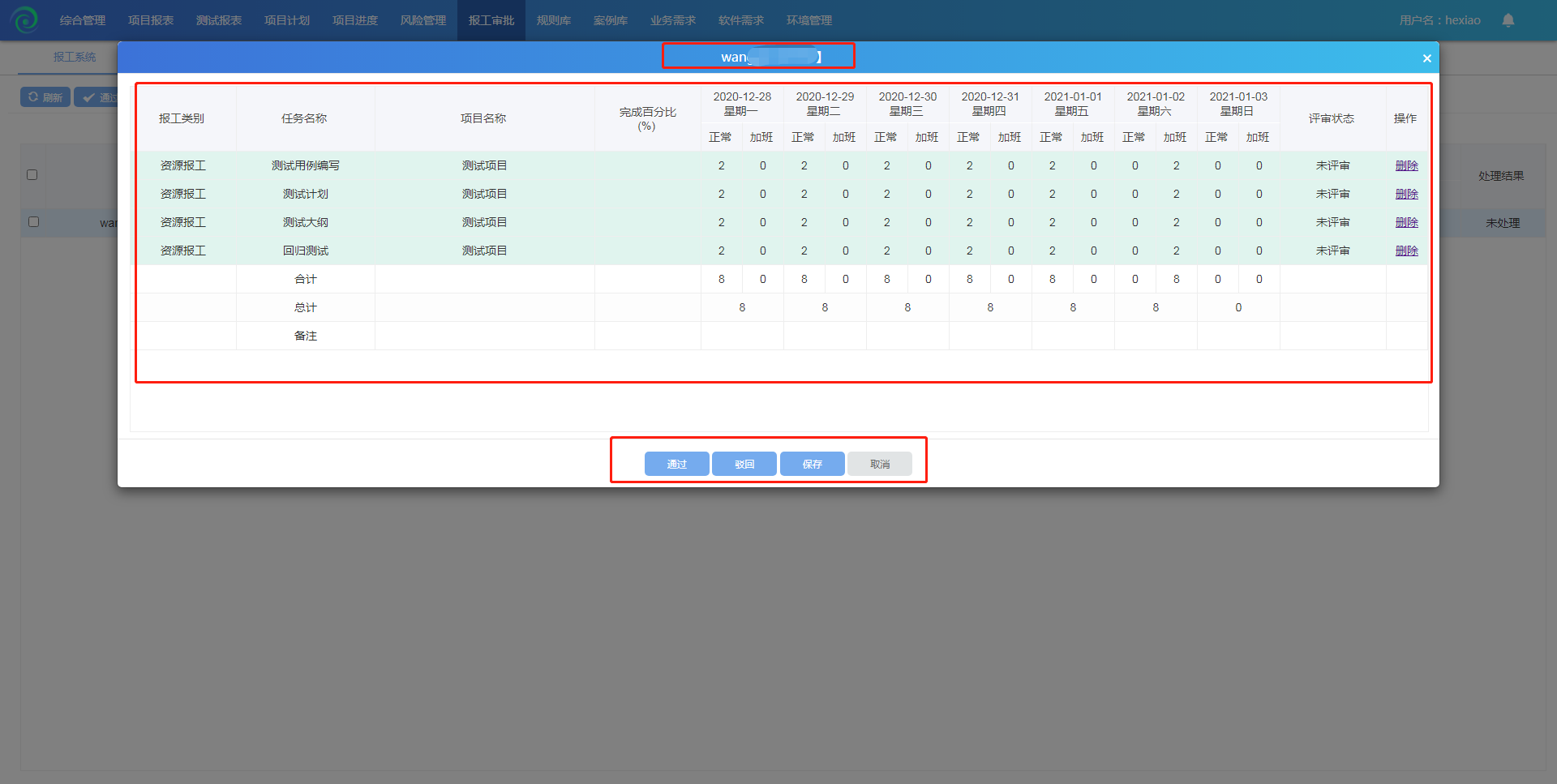 工时审批模块,用于管理人员对项目人员的工时的审批