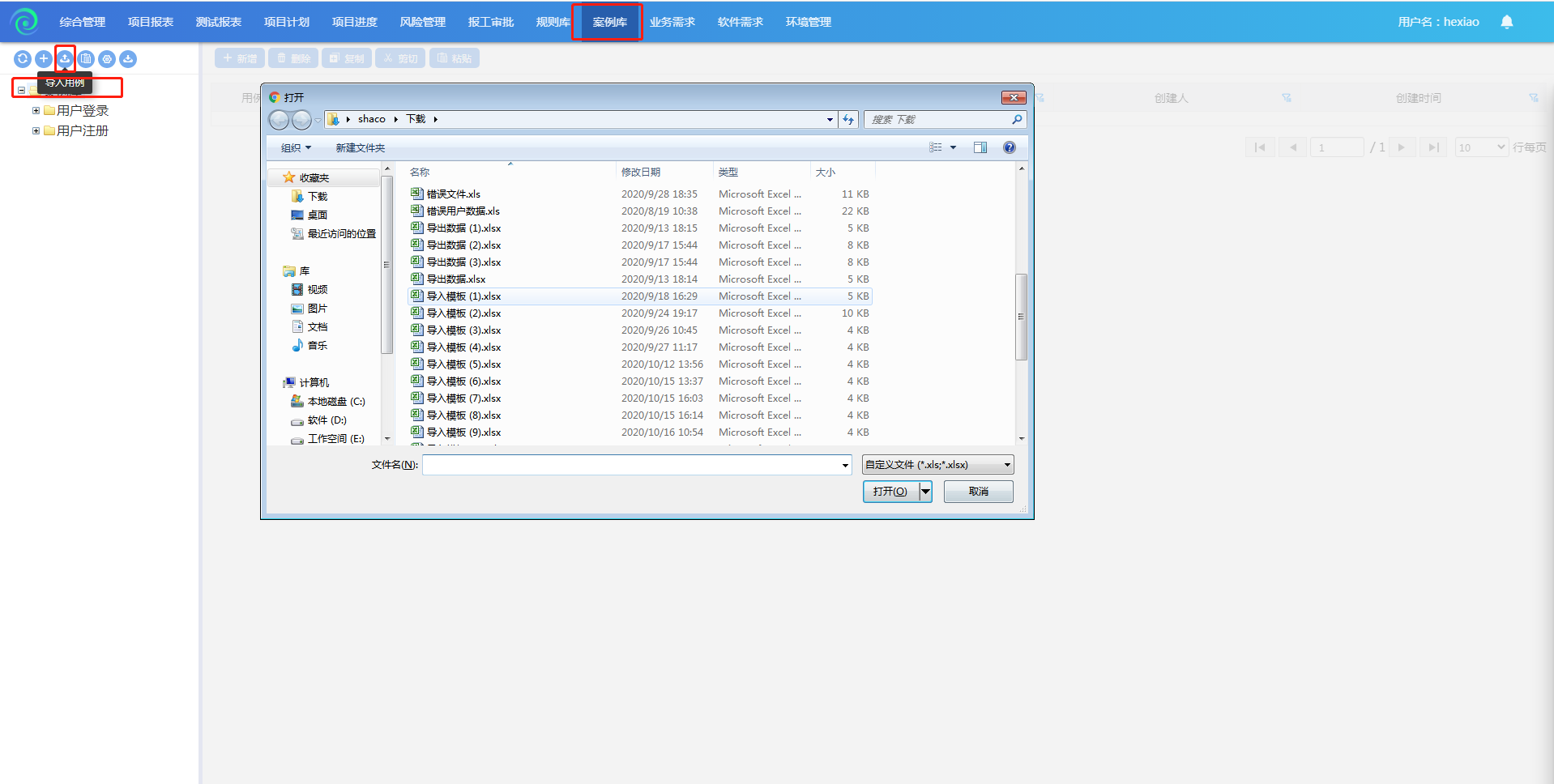 选中根节点,点击导入用例按钮,弹出文件选择框,选择用例文件(excel),即可导入用例;