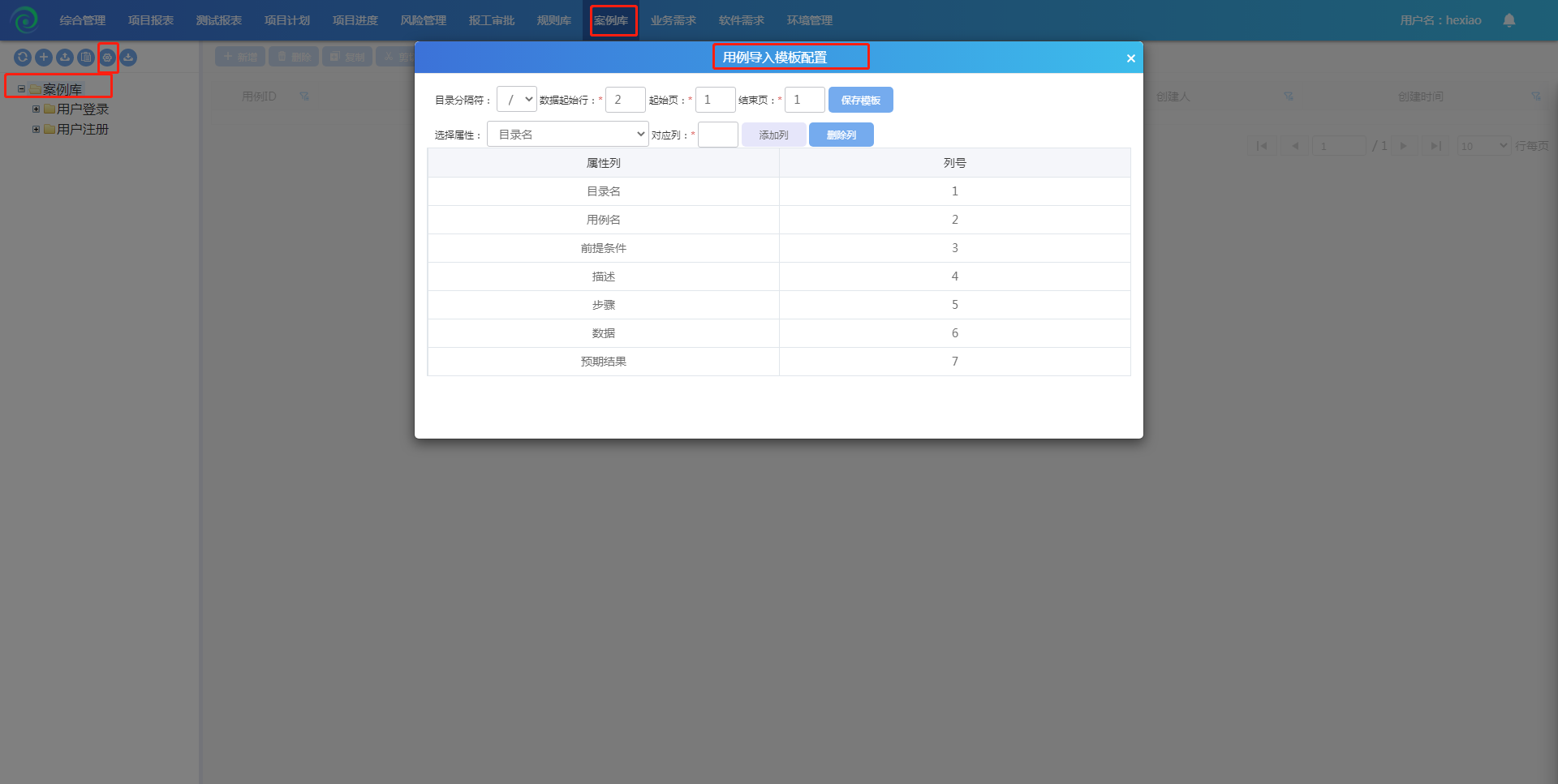 选中根节点,点击导入模板配置按钮,在此可配置导入用例模板,包括添加/删除列、调整列顺序、修改数据起始列、数据取值页等;