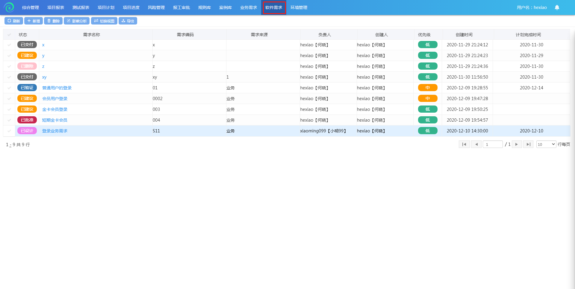 点击【软件需求】进入软件需求管理界面,在此处可以对软件需求进行管理,包括新增、修改、删除、影响分析等操作;