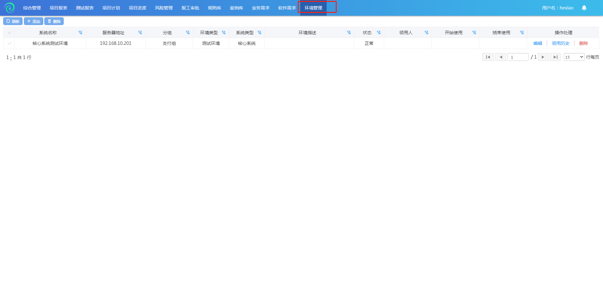 点击【环境管理】进入环境管理管理界面,在此处可以对开发/测试环境进行管理,包括添加环境、删除环境、编辑环境、查看领用历史等操作;