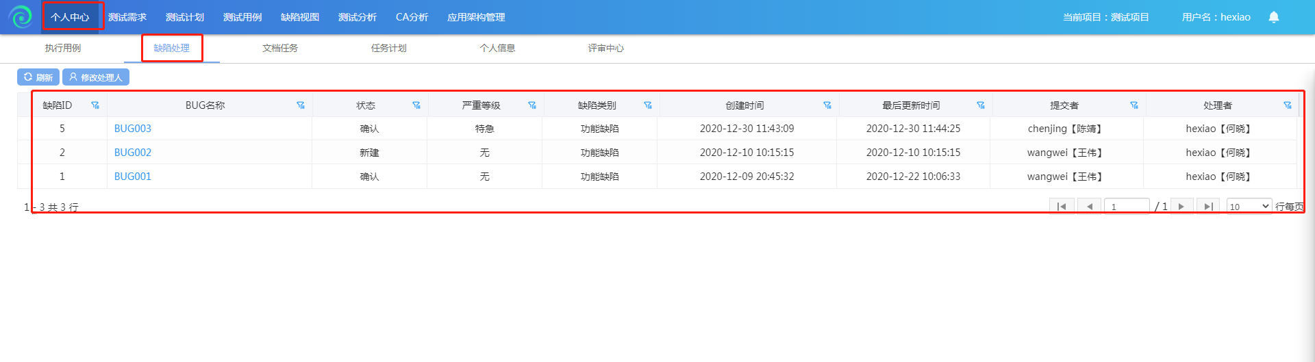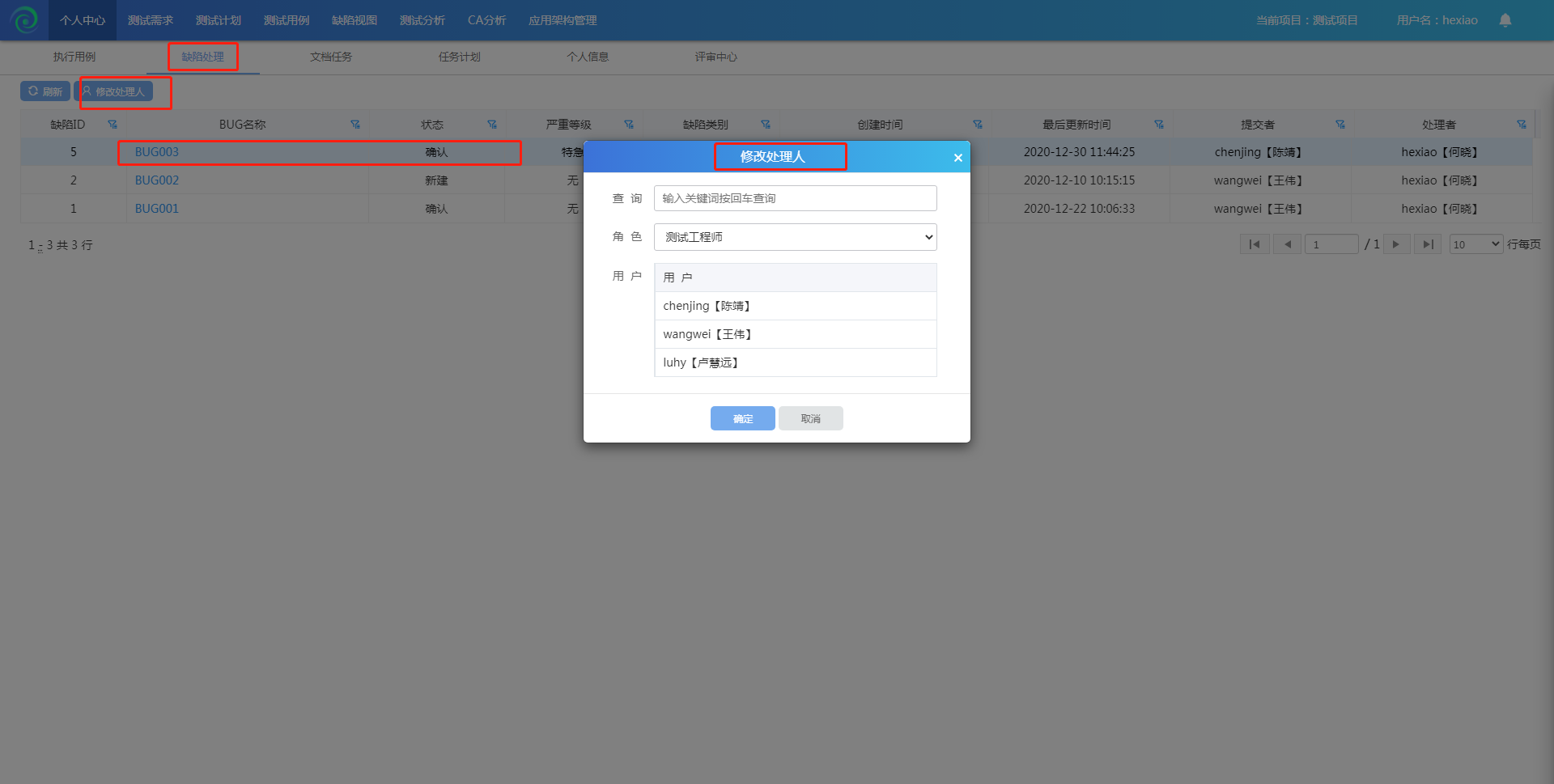 选中一条缺陷,点击修改处理人,选中处理人,点击确认后修改缺陷处理人成功;