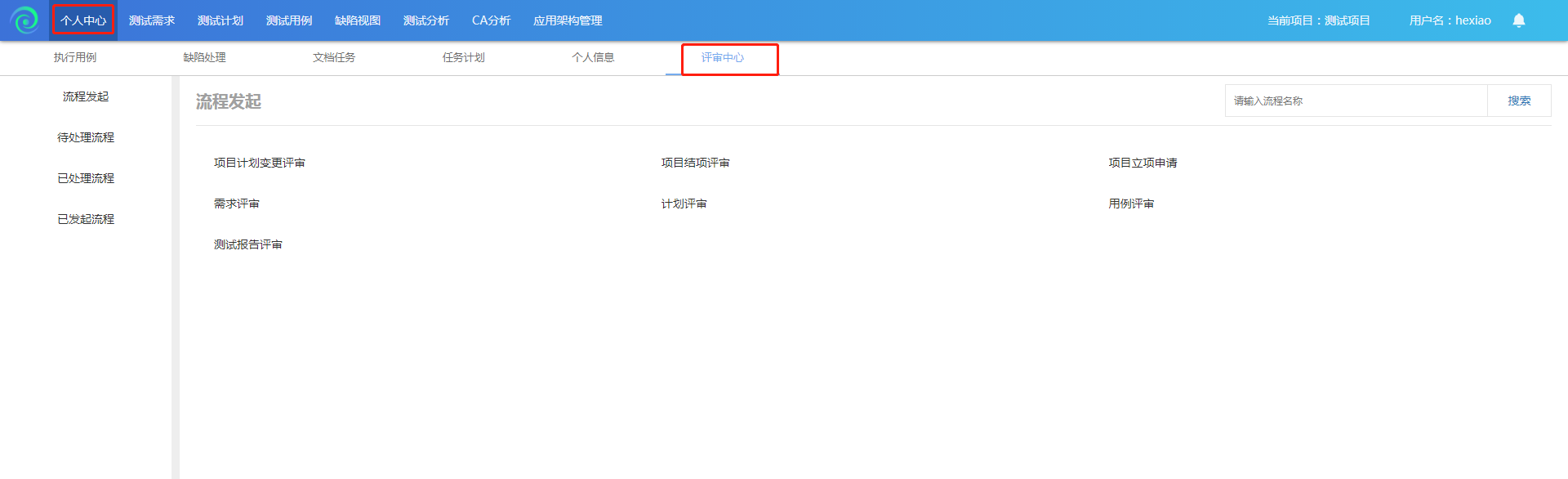 个人中心--评审中心,评审中心有流程发起、待处理流程、已处理流程、已发起流程;下面会分开来详细说明: