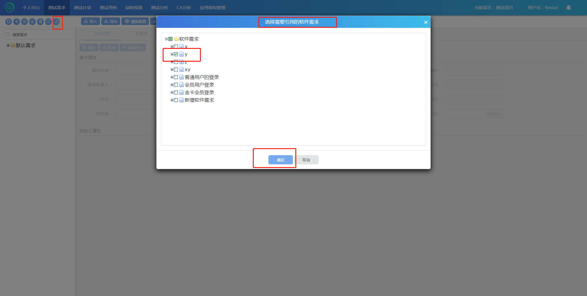 点击引用软件需求按钮,勾选要引用的软件需求(在软件需求模块创建),点击确定,可直接引用软件需求库中的需求;