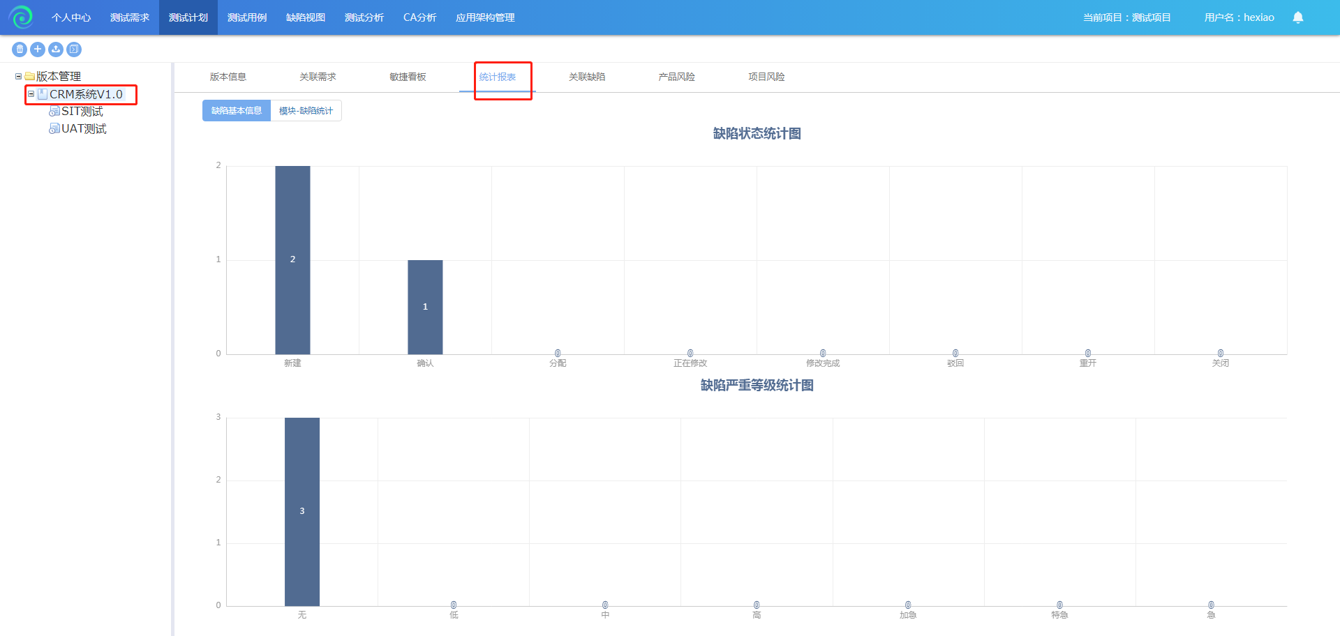 选择一个测试版本,点击统计报表,可以查看缺陷基本信息图、模块-缺陷统计图;
