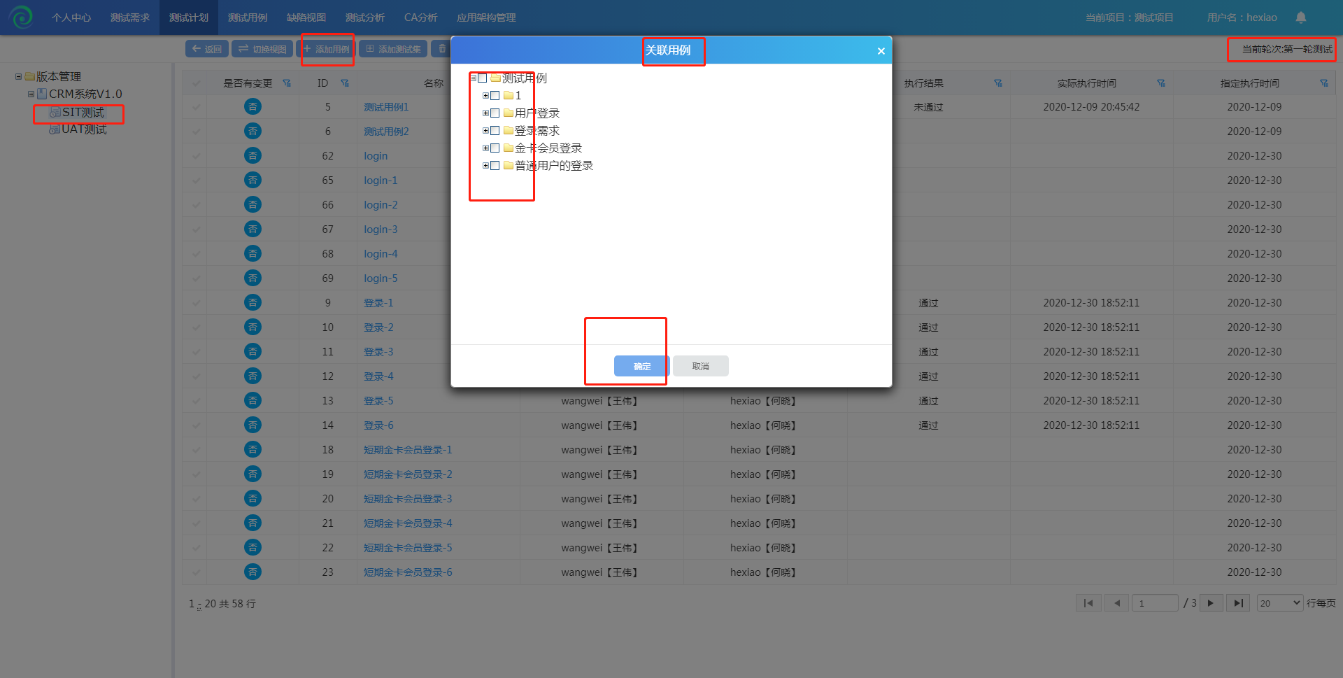 在轮次中,点击添加用例,勾选需添加的用例,点击确定后,轮次关联用例成功;