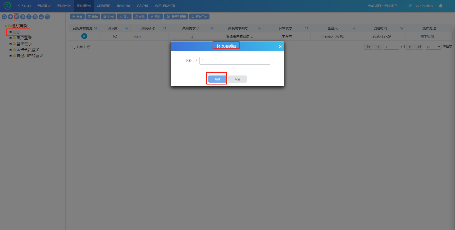 选中一个用例组,点击修改,输入内容后点击确认,用例组信息修改成功;