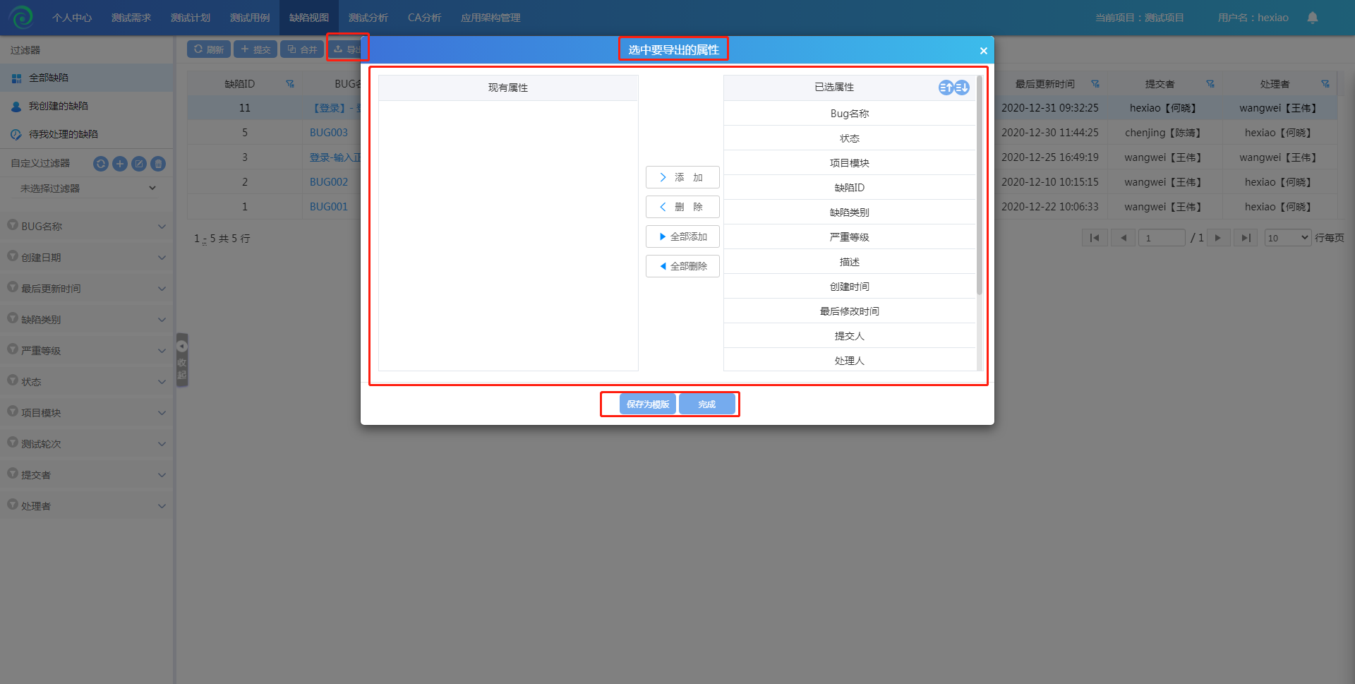 点击导出,选中属性点击添加,点击完成,导出缺陷成功;点击保存模板,模板为保存成功;