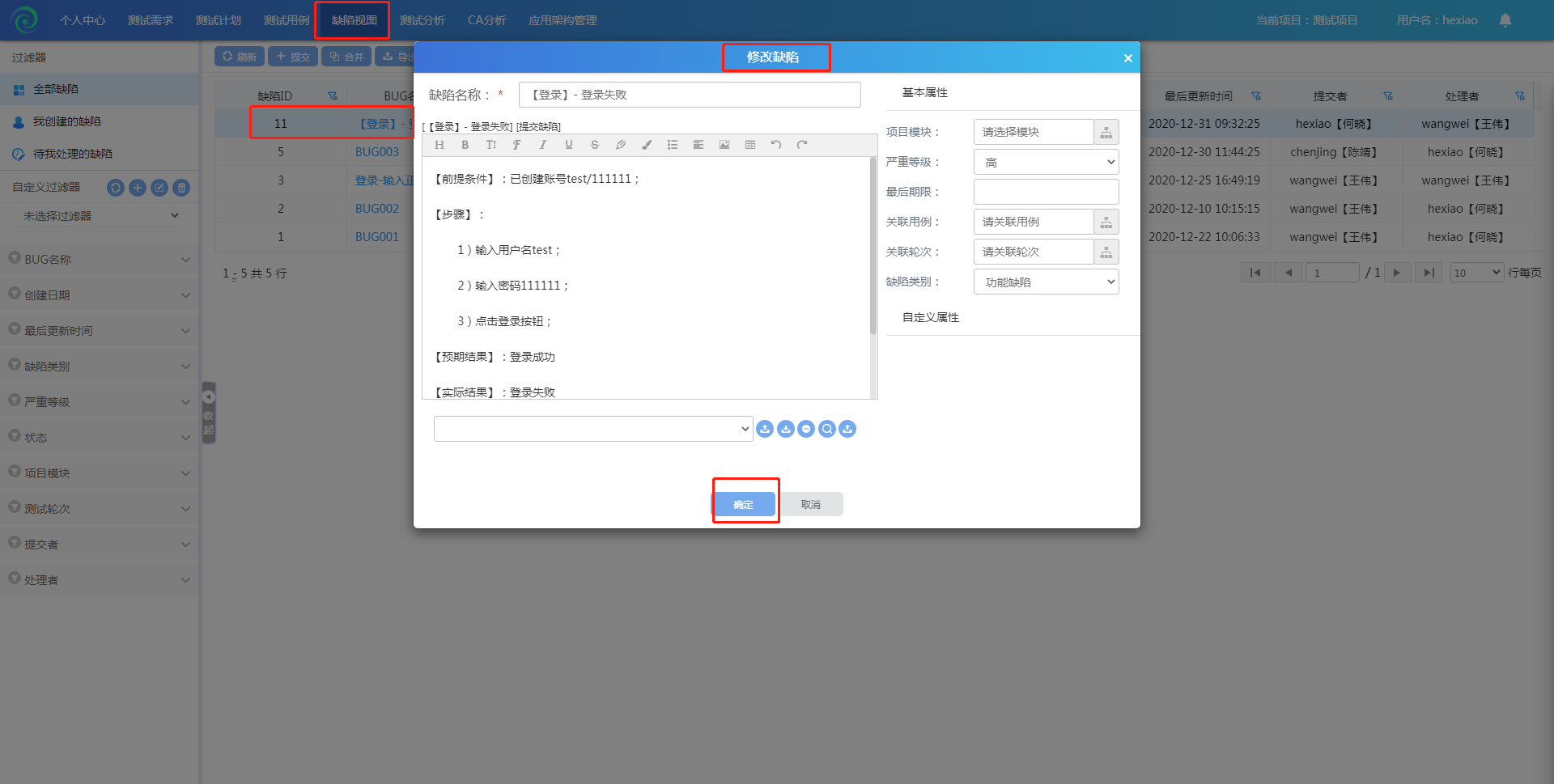 选中一条缺陷,点击修改缺陷按钮,修改缺陷数据,点击确定,即可修改缺陷,可修改缺陷名称、缺陷详情、项目模块、严重等级、关联用例等信息;
