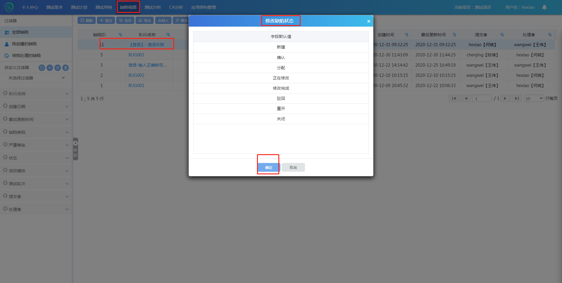 选中一条缺陷,点击修改状态,选择缺陷状态后,点击确定后修改缺陷状态成功;