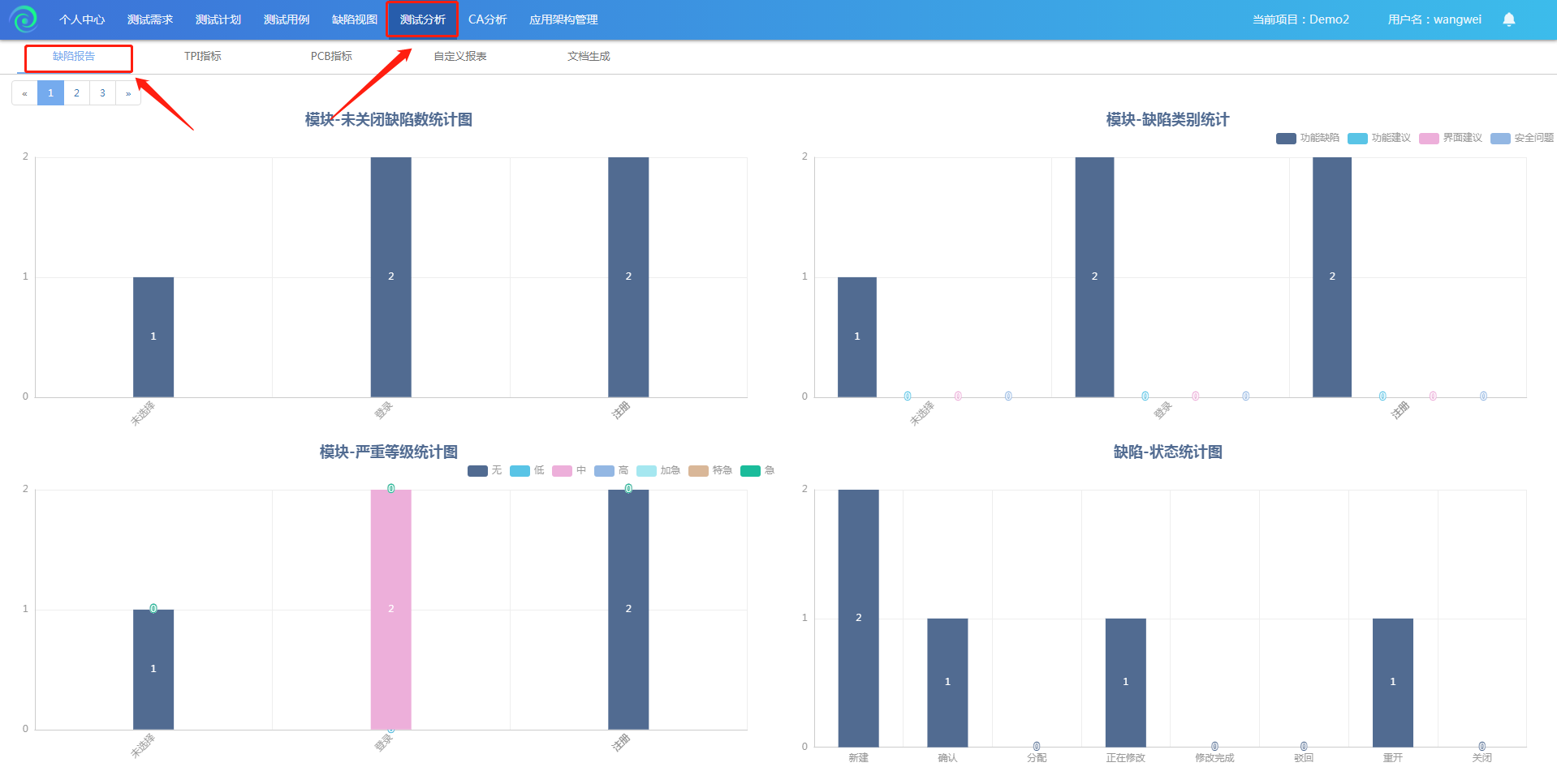 点击缺陷报告,可以查看未关闭缺陷数、缺陷类别统计、严重等级统计、缺陷状态统计