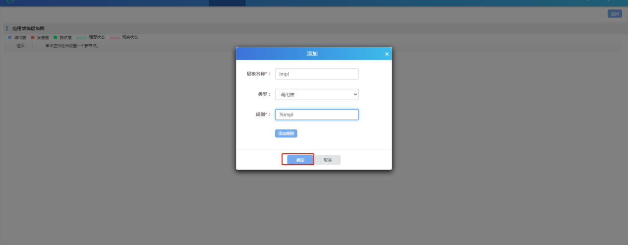 点击添加节点,点击界面,弹出添加节点界面,输入对应的层级名称,类型(根据CA代码结果的展示进行选择对应的类型),规则(根据CA代码结果的展示所使用的类,并支持模糊查询),点击确定