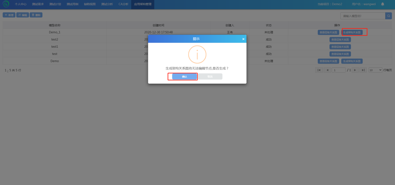 点击返回,点击生成架构关系图,提示生成架构关系图将无法编辑节点,是否生成,