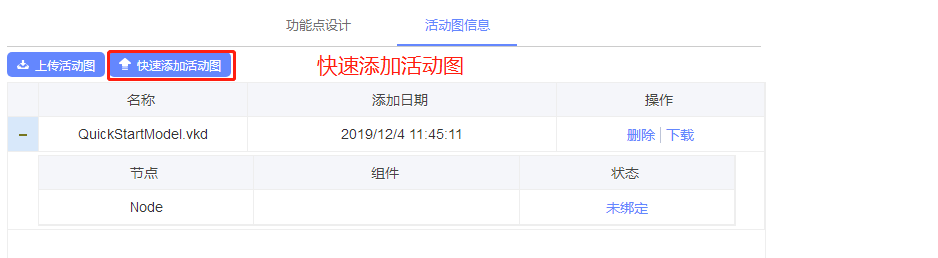 进行新增活动图操作,双击活动图可以进行组件的绑定,新增活动图的方式可以为【上传活动图】和【快速添加活动图】两种方式