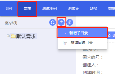在默认需求下添加需求只能通过“新增子目录”进行添加,当默认需求下存在子需求时,我们可以选中一个子需求,点击“新增同级目录”,新增与该子需求同级的需求。