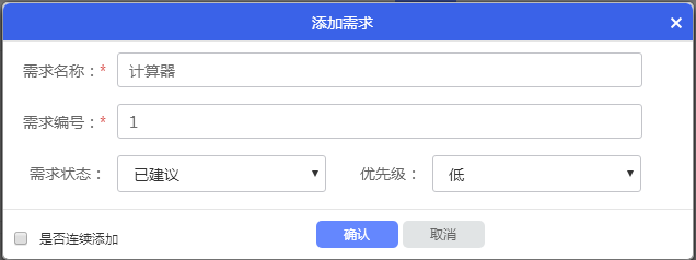 填写需求名称、需求编号,选择需求状态和优先级,点击确认新建需求。