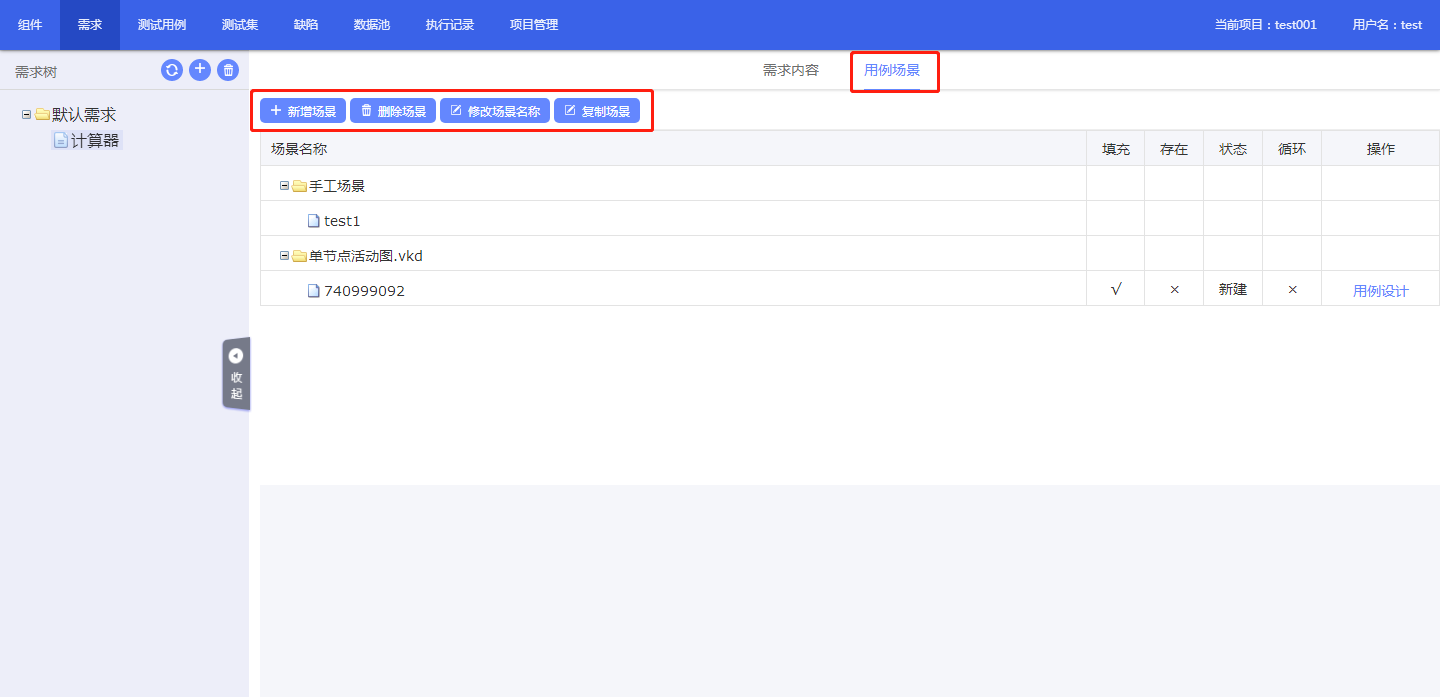 进入用例场景模块之后,可以对场景进行新增,删除,重命名的操作,如图所示:
