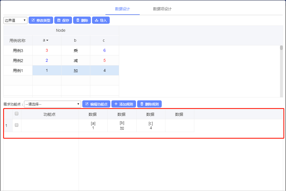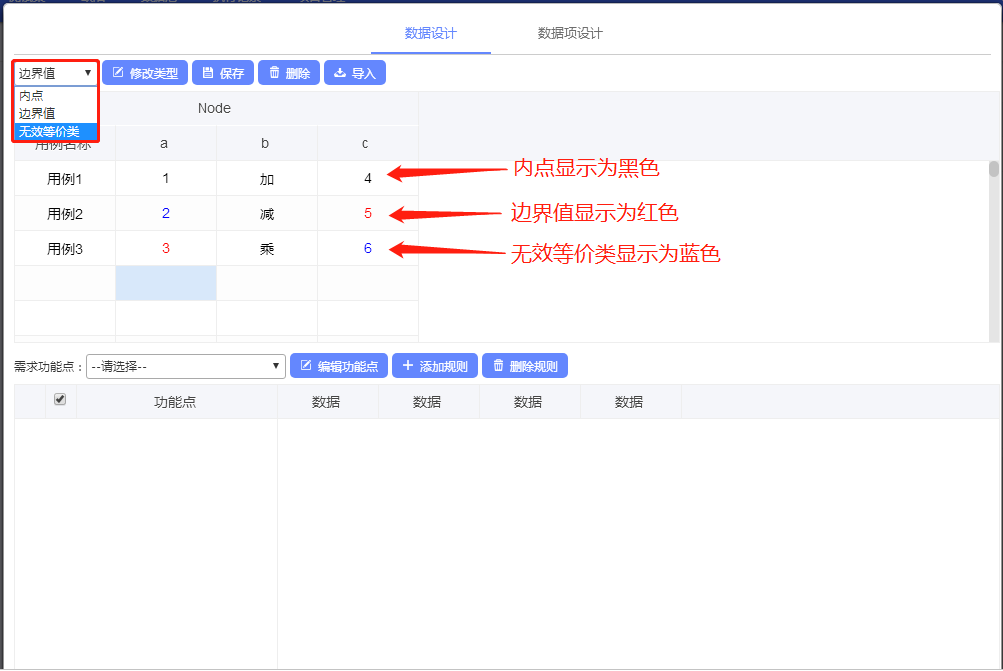 进入用例设计后,可以对用例数据进行设计,通过设置内点、边界值、无效等价类设置数据