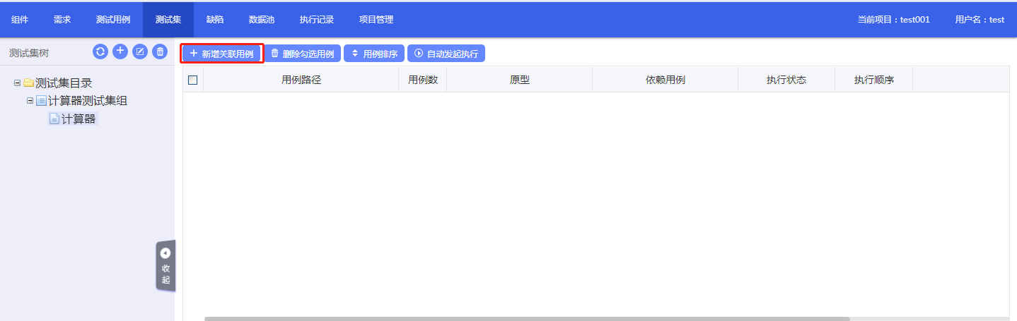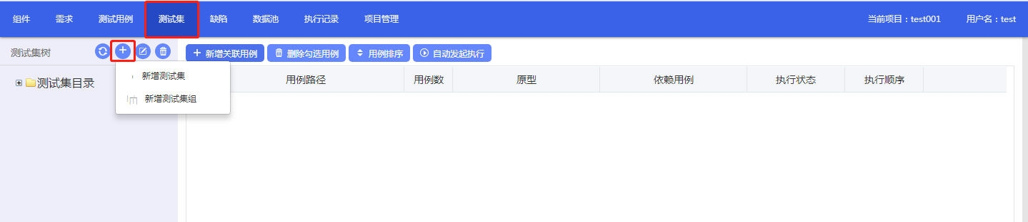 在测试集目录下,新增节点:新增测试集、新增测试集组