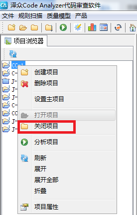 选中要关闭的打开状态的项目,点击文件下的关闭项目,如下图所示,完成项目的关闭,已关闭的项目不能再展开查看源码,不能进行分析