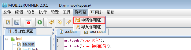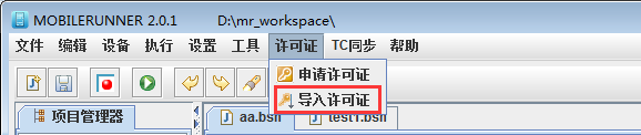 ● MobileRunner的试用期为15天,如果想长期使用需要申请license,申请license的过程: 打开软件,点击菜单【许可证】->【申请许可证】,按工具提示进行申请。