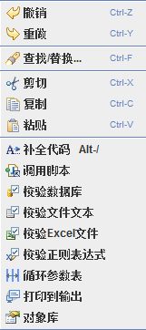 如上所示,所有对脚本的编辑操作都可以在编辑菜单下完成,包括对脚本的撤销,重做,查找,替换,剪切,复制,粘贴,循环参数表,对象库,以及对各种需求的校验。