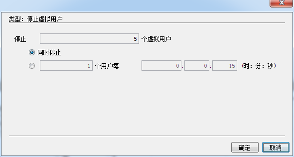 - 停止虚拟用户:该项设定了所有虚拟用户的停止方式,可以选择所有虚拟用户同时停止,也可以选择一段时间内停止指定数目的虚拟用户。