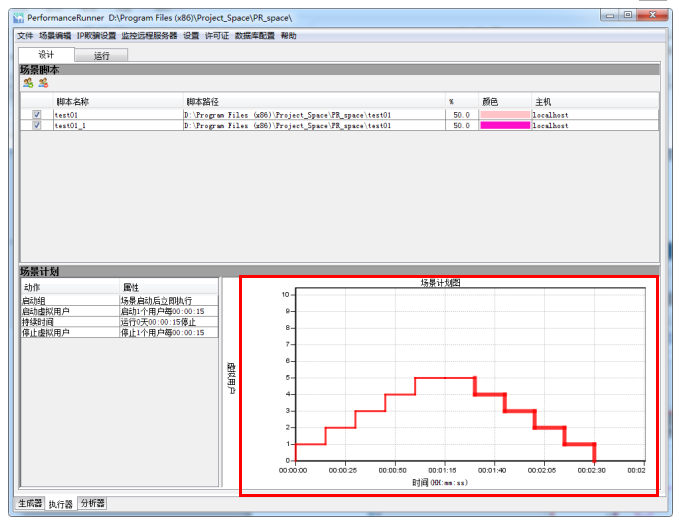 说明:虚拟用户数目会直接影响到压力的大小。在一般情况下,采用递增虚拟用户的方式来寻找系统能够承受的合理压力。比如,预估总虚拟用户数为20个,可以设置初始为2个,每5分钟增加1或2个用户。界面可以配置虚拟用户启动方式,可选择全部启动或者按照某一时间间隔启动指定个虚拟用户方式启动。