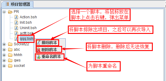 - 排除的脚本没有被彻底删除,只是移出了项目管理器,可以通过在项目节点上右击选择【导入脚本】将其再次导入进项目中。