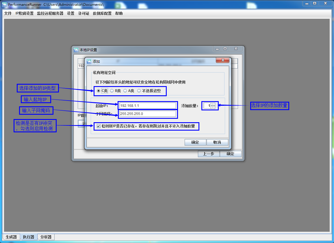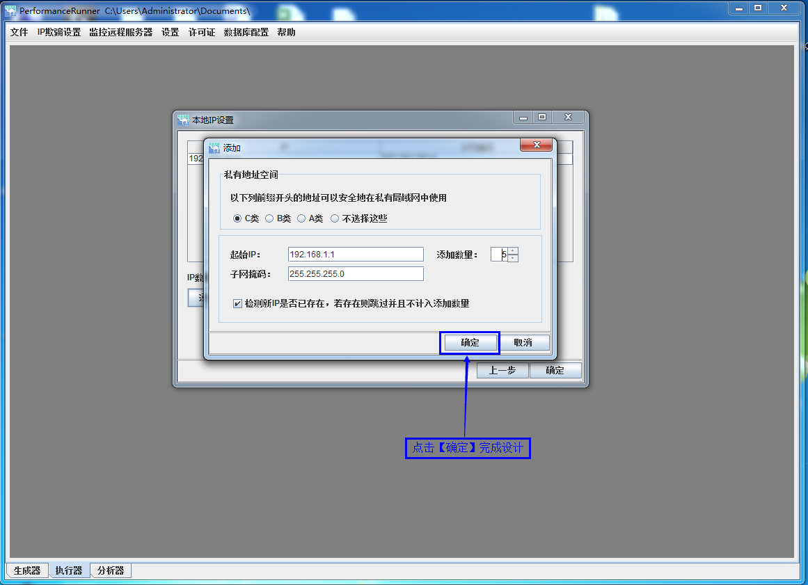 选择IP类型,输入起始IP,子网掩码,选择是否启用IP冲突检查,选择IP添加数量,点击【确定】结束设计,【添加】窗口关闭