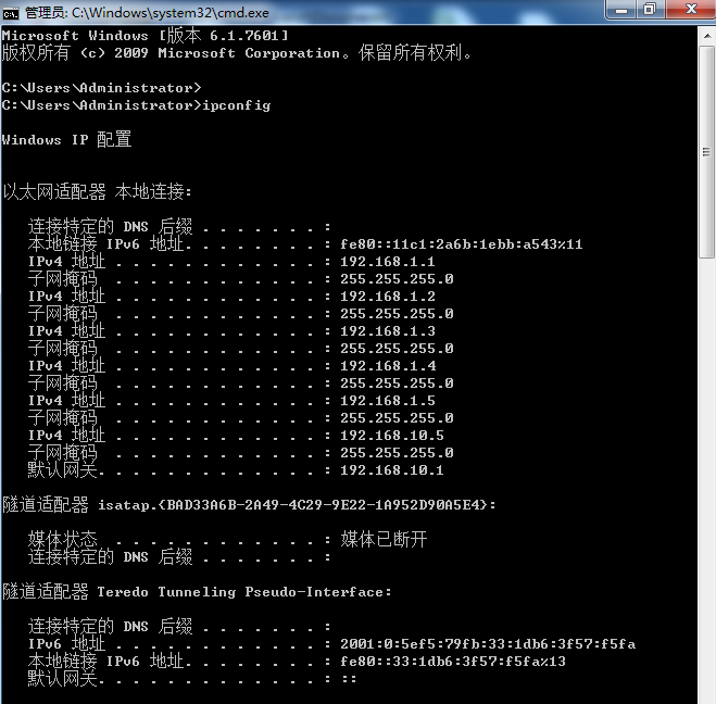 打开windows cmd.exe,输入“ipconfig”命令,可以查看到新添加的ip地址信息