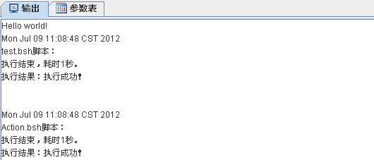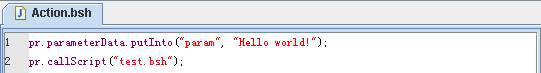 下面是一段Action.bsh中的脚本,用putInto命令将Hello world!字符串保存到名为param的变量用,变量名可以任取,其中parameterData是一个ParameterData类型的全局变量。接着是调用test.bsh脚本。