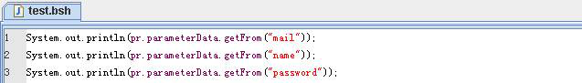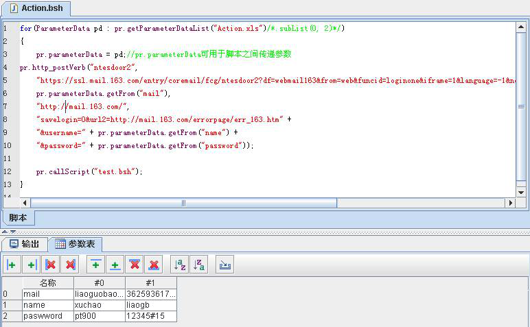 循环参数表执行一个登陆操作,第3句,这一句把临时变量pd保存在了pr.parameterData参数中,因为在test中还会用到pd参数。第12句调用test.bsh 打印参数结果。