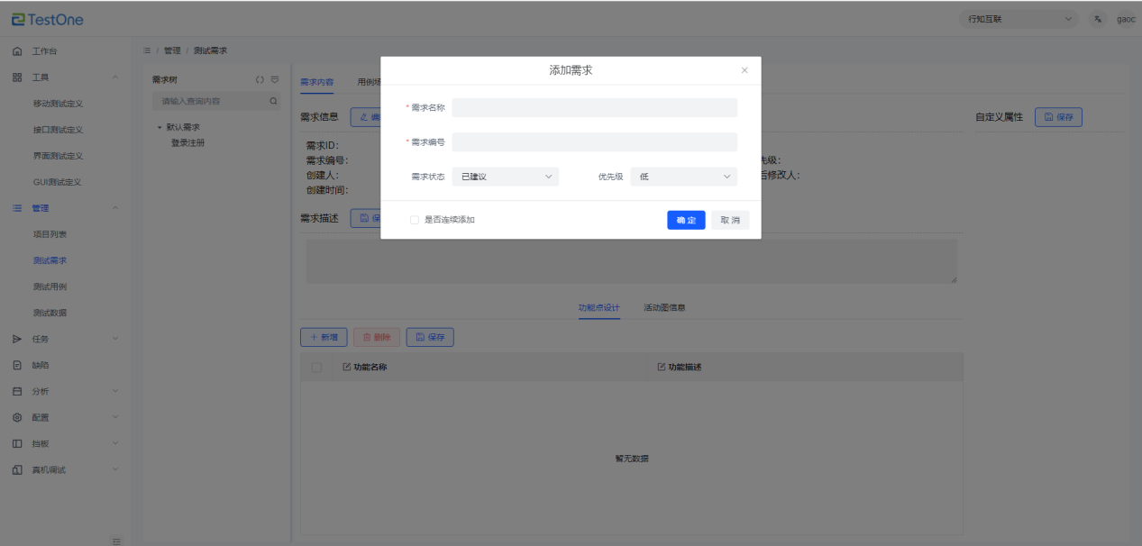 TestCenter 测试管理平台通过需求、测试计划、测试用例、缺陷管理、评审中心等管理模块的相互作用形成完整的测试管理系统,模块各司其职快速高效的完成对整个测试项目生命周期管理规范项目执行过程、获得高品质的项目产品。后台管理主要关注企业的组织分解结构和项目分解结构信息、包括对企业现在拥有的人力与非人力资源管理以及对过去商业客户信息维护,清晰明了的展示了资源使用的层级结构,方便了资源的维护;高层视图主要管理项目的立项以及该项目的缺陷流程定制,界面属性流程定制等为规范项目流程而做的配置管理与维护,案例库主要对项目可复用资料的管理,并维护测试资产,确保测试资产存储、复用、维护等功能。测试项目中针对项目测试过程中的测试节点,如需求、测试计划、轮次、测试用例均可进行线上评审,并支持需求用例强关联、用例缺陷强关联;从而对整个测试项目生命周期进行规范化管理。