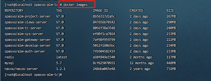 此版本TestCenter共计10个镜像,其中3个基础服务(mysql、redis、nacos/nacos-server),另外7个是TestCenter应用服务(spasvo/alm-project-server、spasvo/alm-views-server、spasvo/alm-tc-server、spasvo/alm-sys-server、spasvo/alm-gateway-server、spasvo/alm-develop-server、spasvo/alm-auth-server);