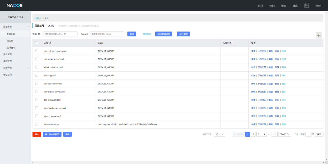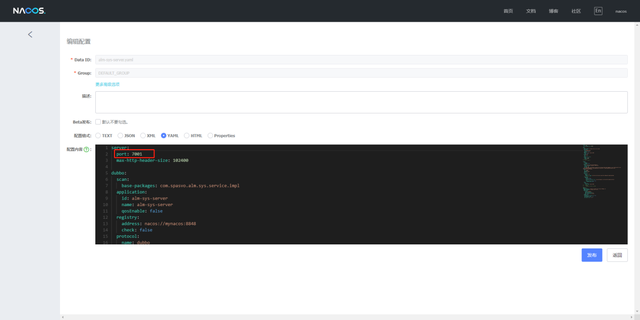 在配置列表中编辑想要修改的服务的配置,如果修改的是mysql、redis的配置,则此处所有的服务配置都需要修改;若修改的是TestCenter服务配置,则修改完成需要检查alm-gateway-server的配置,将其对应服务端口修改为最新的,否则会导致服务访问失败;
