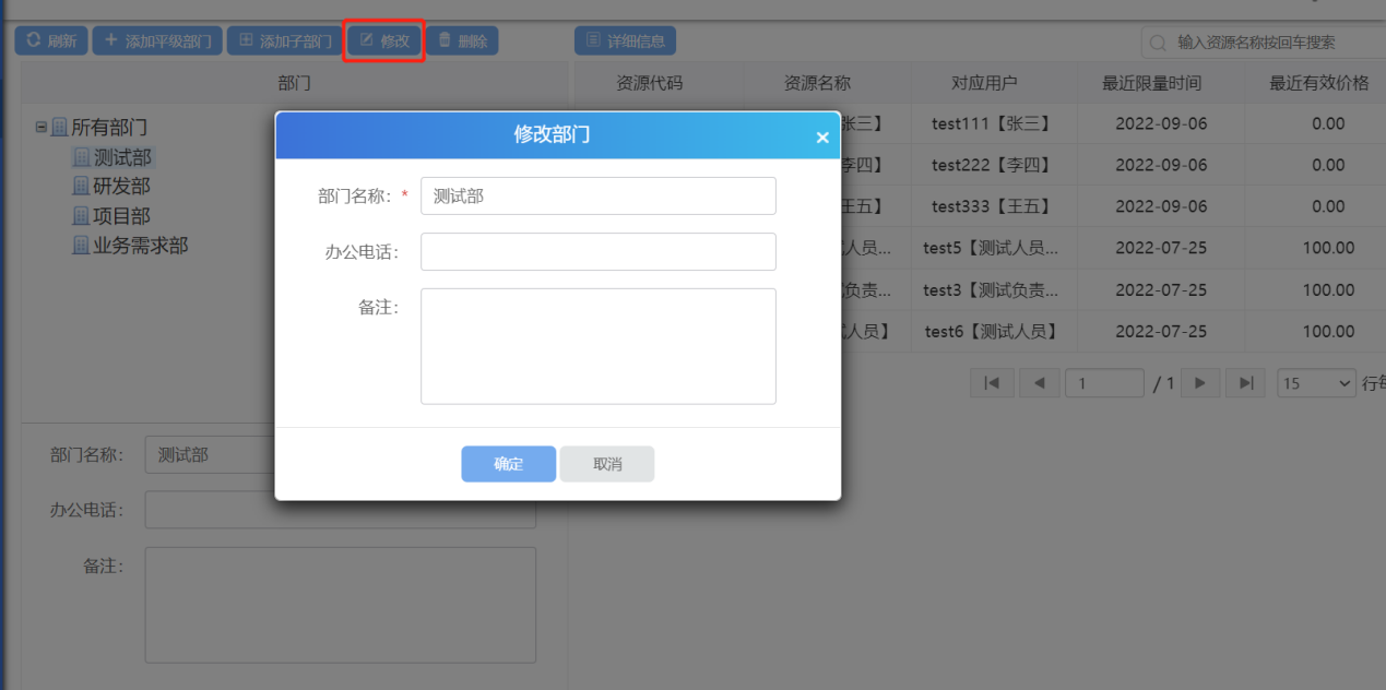 选中部门,点击修改,弹出修改界面;可修改部门信息;