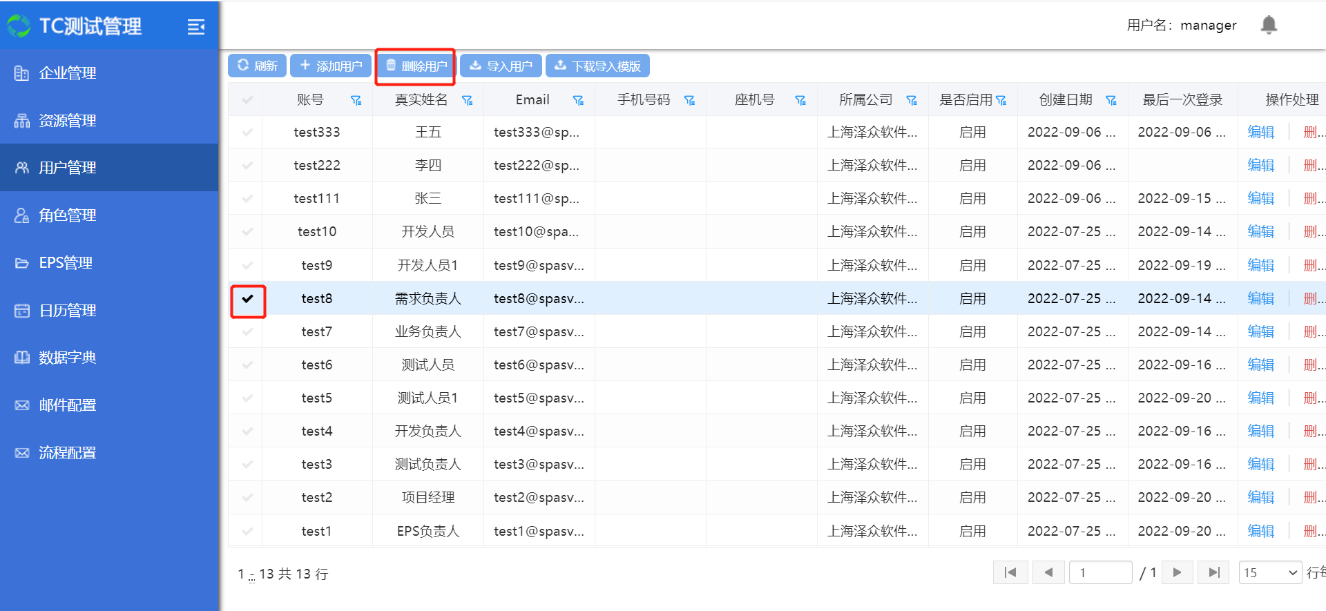 勾选用户,点击删除用户,确认后删除成功;