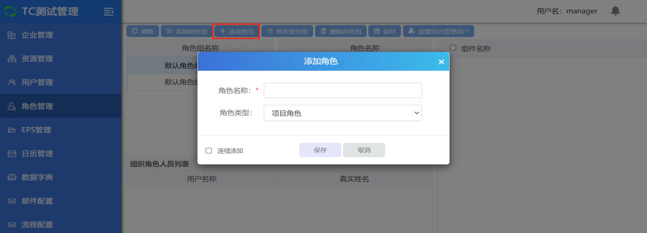 点击【添加角色】按钮,进入创建角色页面,输入角色名称,选择角色类型:项目角色和综合管理角色,点击确定按钮完成添加,当然也可以勾选“连续添加”连续添加。