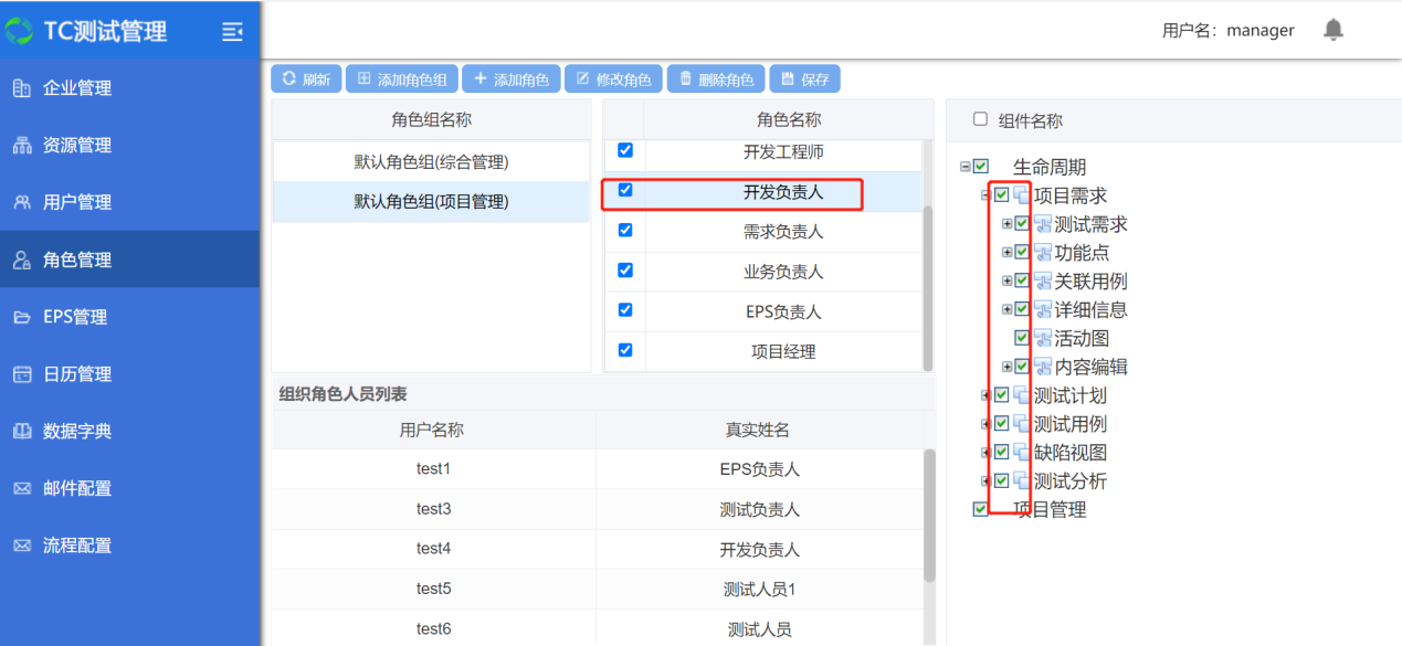每个角色都有各自的权限,勾选角色,勾选组件,点击保存按钮,保存角色下的权限。