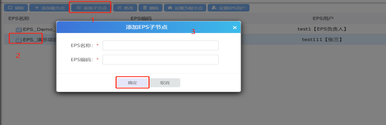 选中EPS,点击【添加子节点】按钮,进入创建子EPS页面,输入EPS信息,点击确定按钮完成添加