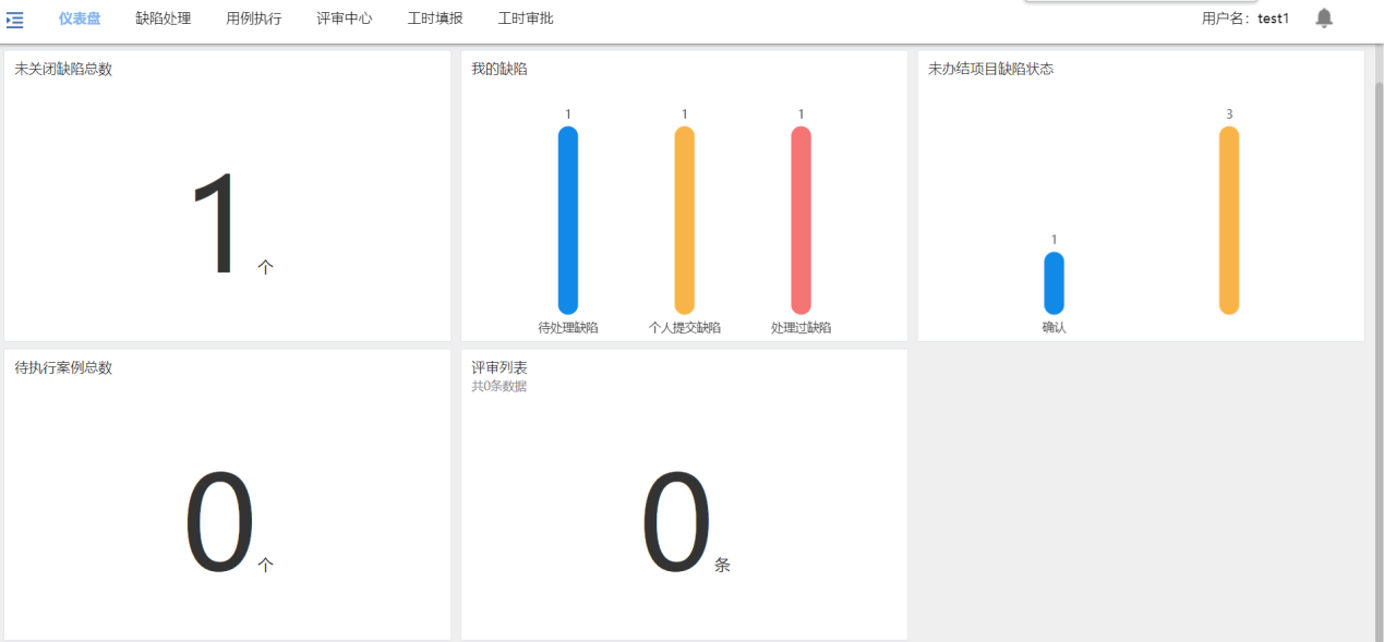 我的缺陷:展示待当前用户处理的缺陷总数、个人提交缺陷总数、处理过缺陷总数,已柱状图展示(不区分项目);